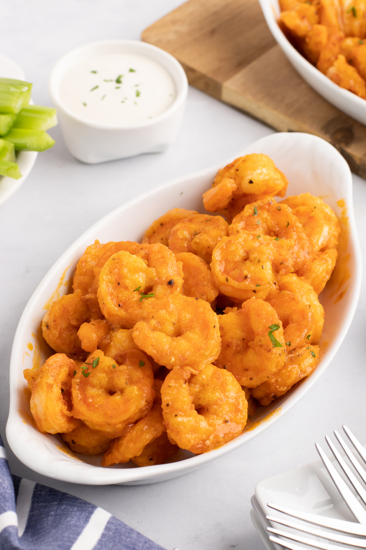 A white serving dish filled with buffalo shrimp. Hot sauce, ranch, and celery sticks out of focus in background.