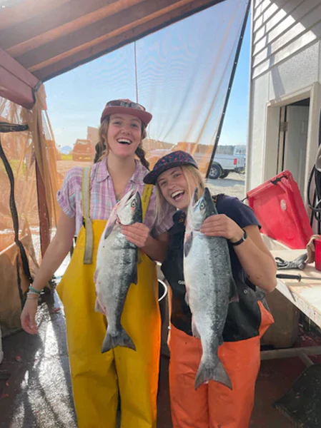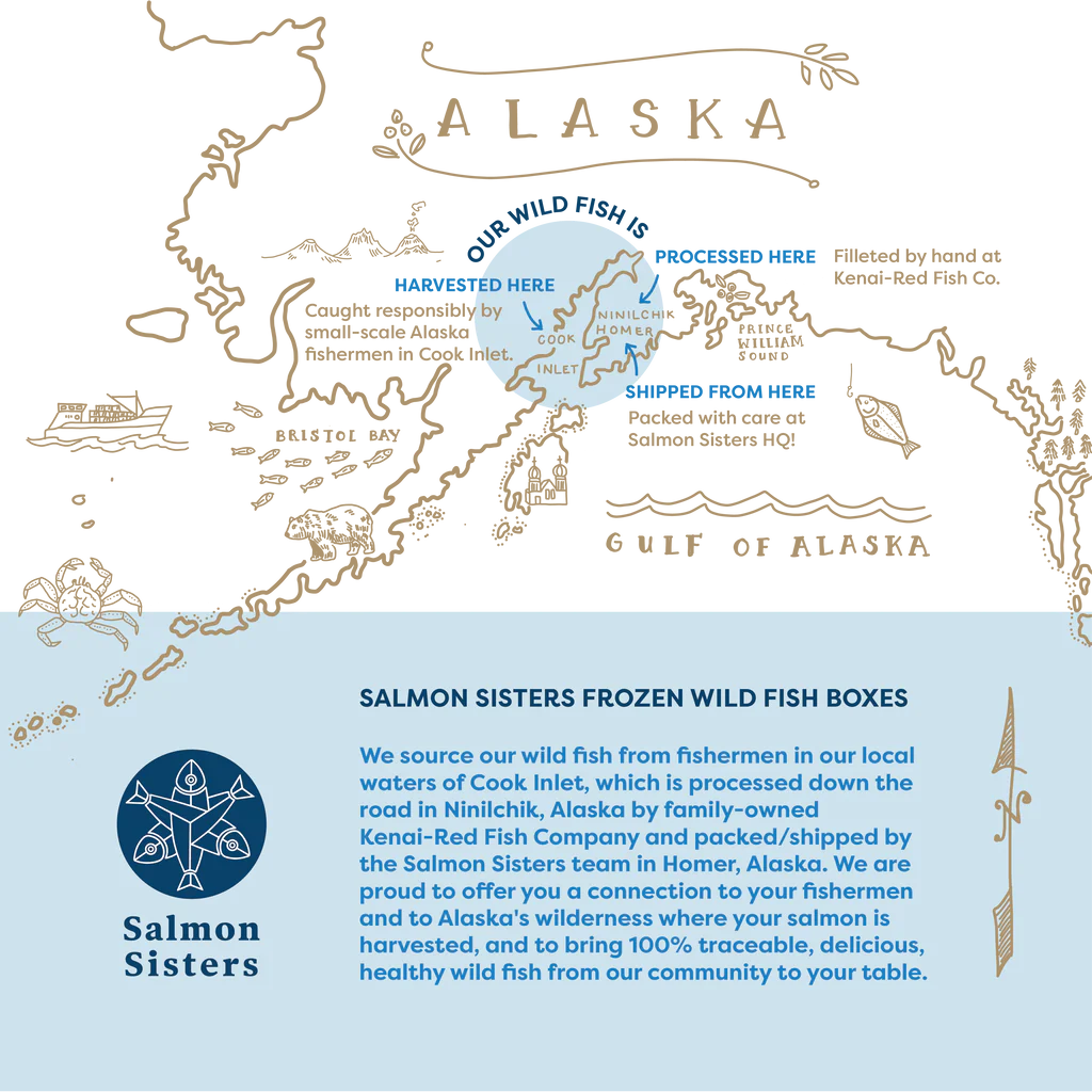 En tant que propriétaires d’entreprise et mères de jeunes enfants qui ne pêchent pas et ne travaillent pas autant sur l’eau, développer nos racines dans notre ville natale, Homer, et dans la péninsule de Kenai a été gratifiant et significatif à cette étape de la vie. Nous aimons soutenir l’économie locale qui soutient Salmon Sisters, l’approvisionnement en poisson et le soutien aux moyens de subsistance des pêcheurs et des travailleurs de la transformation de notre communauté. Nous aimons également envoyer à nos clients du poisson provenant des belles eaux sauvages que nous aimons ; et savoir exactement de quels bateaux vient le poisson et quels pêcheurs l’ont pêché. Nous nous rappelons quotidiennement à quel point nous avons de la chance de vivre et de travailler dans un endroit où les saumons sauvages nagent librement et nous sommes si heureux de pouvoir partager des boîtes de cette abondance avec vous !