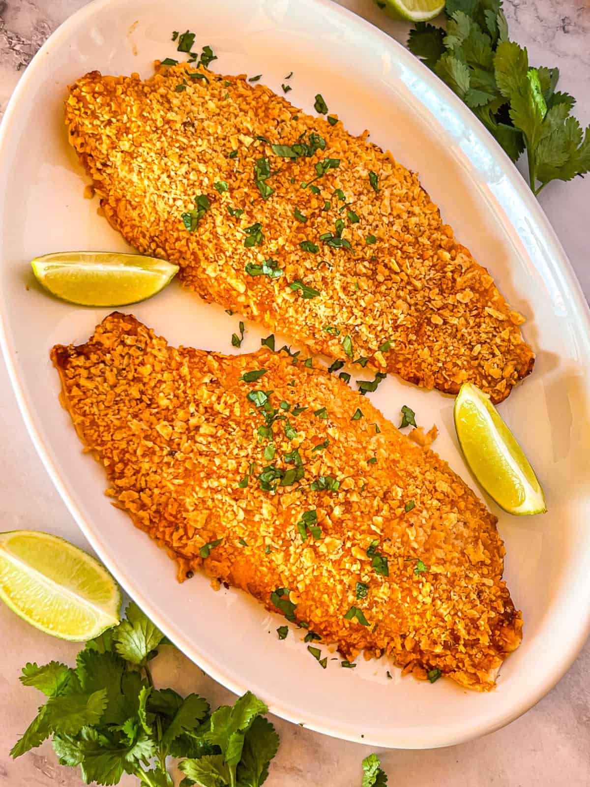 Saupoudrer des croustilles de tortilla écrasées sur les filets. Air frire à 400 degrés pendant 9 à 10 minutes jusqu’à ce qu’il soit doré et cuit.