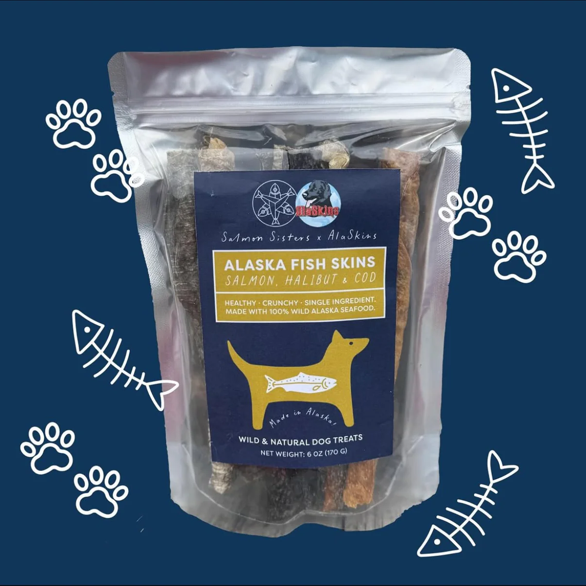 Nous sommes ravis de nous associer à une autre petite entreprise appartenant à des femmes, AlaSkins, pour fabriquer des friandises saines, croquantes, sauvages et naturelles pour chiens dans la péninsule de Kenai. Fabriqués à partir de peaux de poisson 100 % sauvages d’Alaska qui sont normalement jetées lors de la transformation, ils constituent un régal spécial pour tous nos amis à quatre pattes.