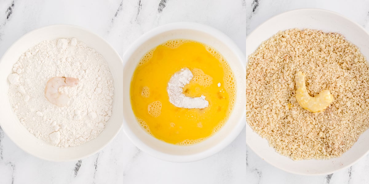 Dans un autre bol peu profond, mélanger la chapelure panko, le paprika, la poudre d’ail, la poudre d’oignon, le sel casher et le poivre noir. Tremper chaque crevette crue dans la farine, puis dans les œufs battus et enfin enrober les deux côtés du mélange panko assaisonné.