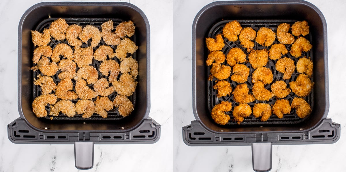 Placer dans le panier de la friteuse et cuire pendant 8 à 12 minutes à 375F, jusqu’à ce que les crevettes soient dorées et croustillantes.