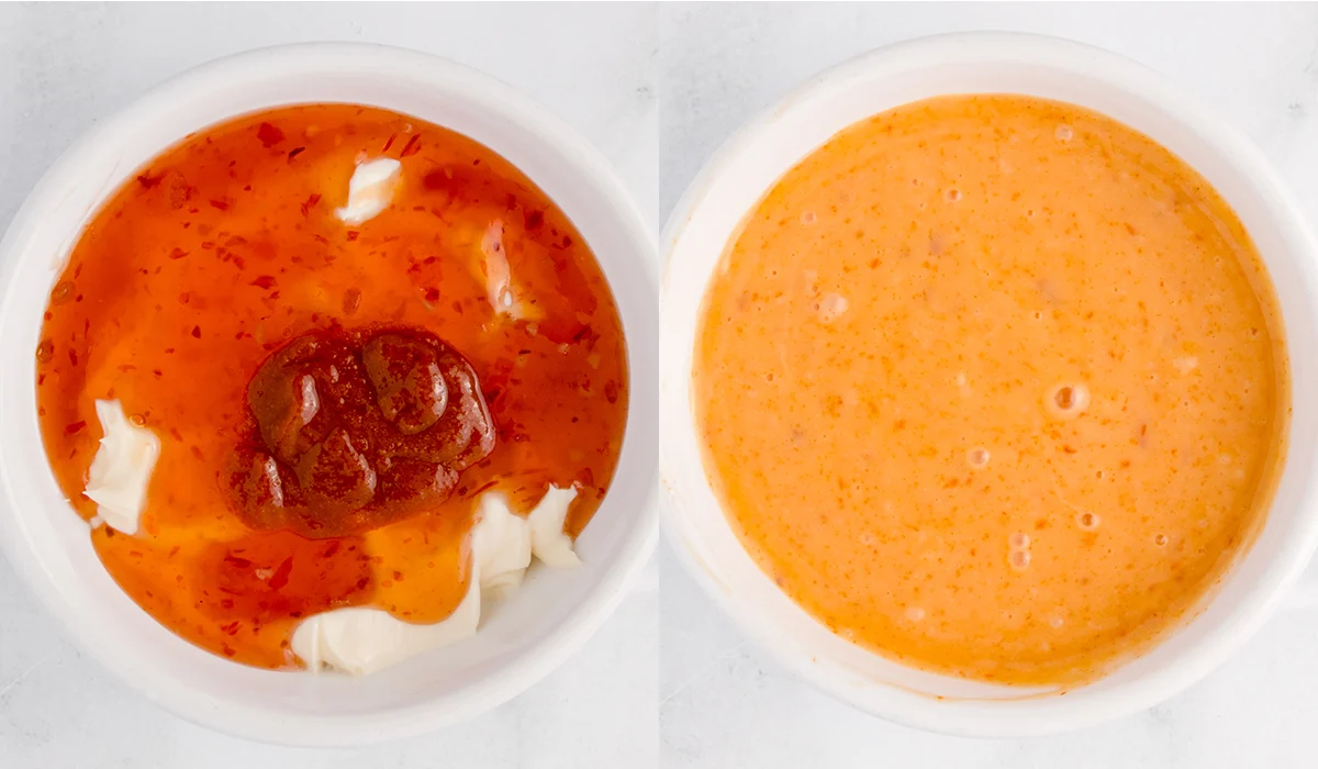 Pour préparer la sauce, placez la mayonnaise, la sriracha et la sauce chili douce dans un petit bol. Remuer pour combiner.