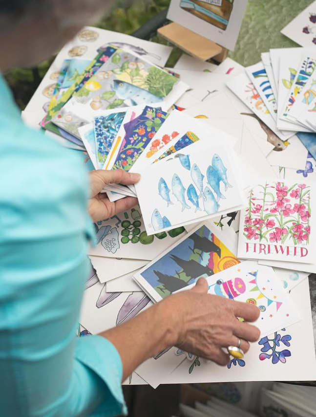 Valisa vit et travaille de l’autre côté de la baie des magasins Salmon Sisters, dans une petite ville appelée Seldovia. Bien que ses œuvres puissent sembler uniquement constituées de peinture à l’aquarelle, elles sont en réalité créées avec des centaines de petits morceaux de papier coloré. Découpée à la main, chaque pièce est soigneusement mise en place pour créer ces magnifiques images et paysages, presque tous inspirés de sa vie en Alaska.