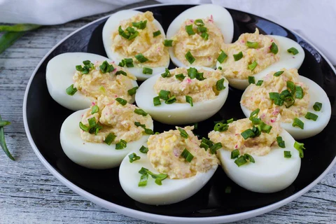 Garnissez vos œufs à la diable d’un beau morceau de chair de crabe géante ! Au lieu de paprika, nous terminons nos œufs farcis garnis de chair de crabe avec un peu d’assaisonnement Old Bay et de la ciboulette fraîche hachée. Une alternative simple qui donne envie à tout le monde d’en savoir plus !