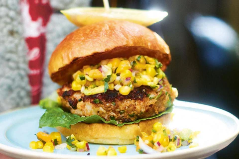 Sliders de gâteau au crabe avec salsa de maïs et d’oignons verts