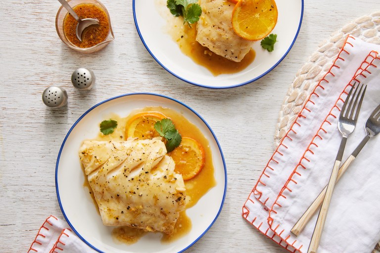 - Placer les tranches d’orange autour du poisson et verser la moitié restante du mélange d’agrumes (à l’exception des 2 cuillères à soupe réservées) sur le haut du poisson. Couvrir librement avec du papier d’aluminium. Cuire le poisson pendant environ 20 minutes. Retirer le papier d’aluminium et continuer à cuire, à découvert, pendant environ 5 à 10 minutes de plus, ou jusqu’à ce que le poisson soit cuit et s’écaille facilement.