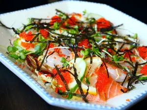 Le chirashizushi est un type de sushi composé de racines de lotus, de crevettes et d’une omelette aux œufs finement râpée sur du riz au vinaigre. C’est un plat largement apprécié lors des célébrations.