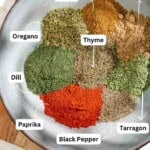 • Combinez les herbes et les épices. Dans un petit bol à mélanger, mélanger le paprika sucré, l’aneth séché, la coriandre moulue, le cumin moulu, l’origan séché, le thym séché, l’estragon séché et le poivre noir moulu.