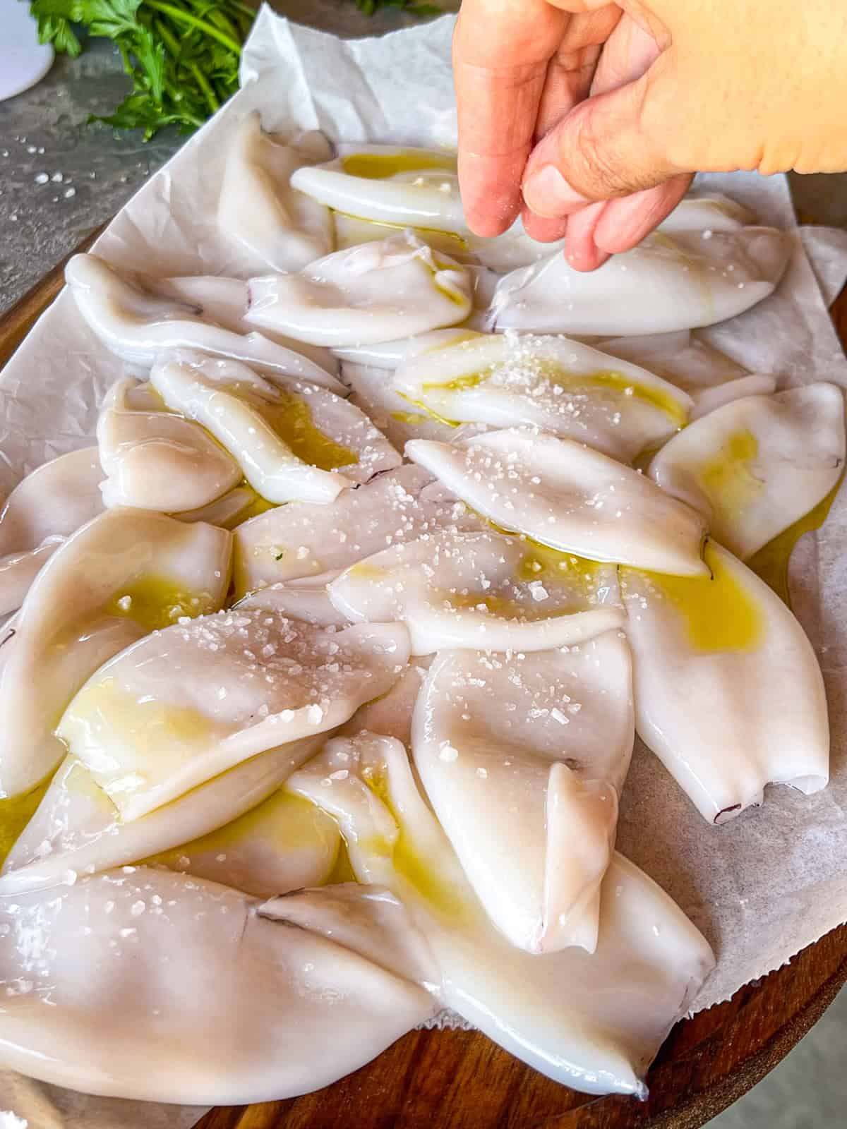 - Préparez les calamars : Séchez les tubes et les tentacules des calamars avec du papier absorbant. Mélanger avec de l’huile d’olive et assaisonner de sel et de poivre.