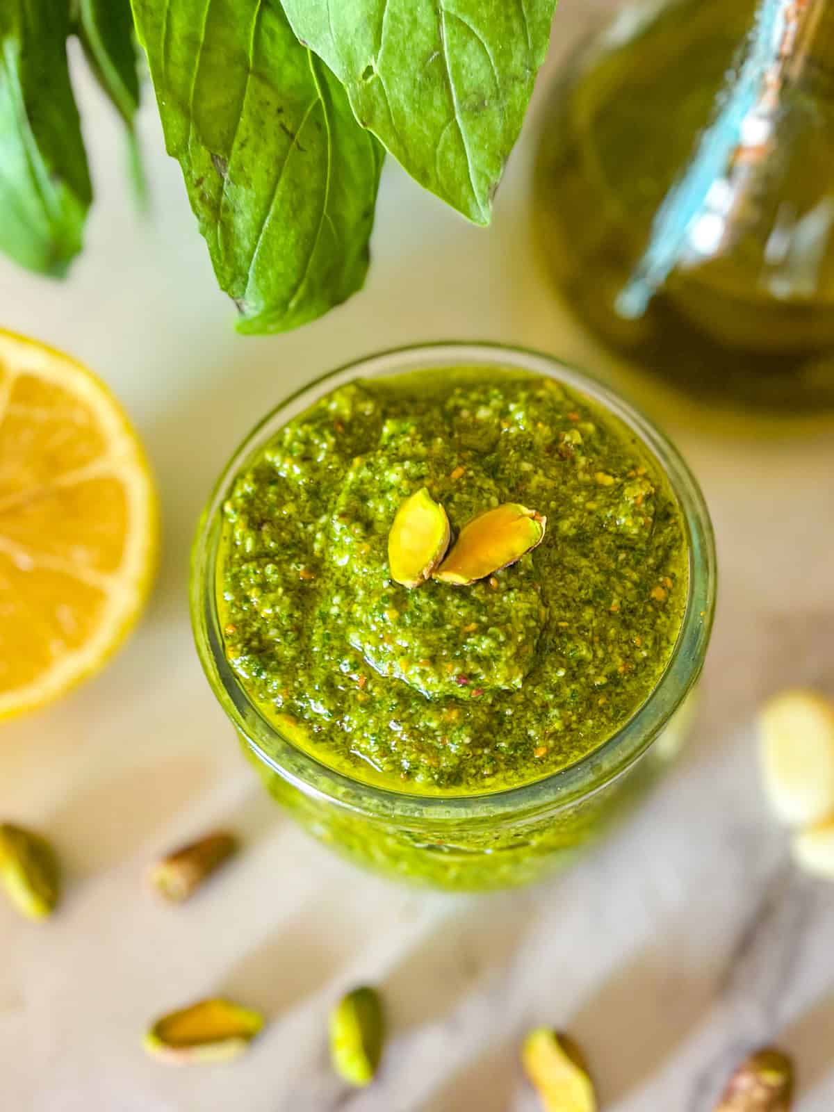 Vous allez adorer ce riche pesto de pistache au beurre avec un jus de citron brillant. Parfait pour les pâtes, étalé sur des sandwichs ou plonger les légumes.