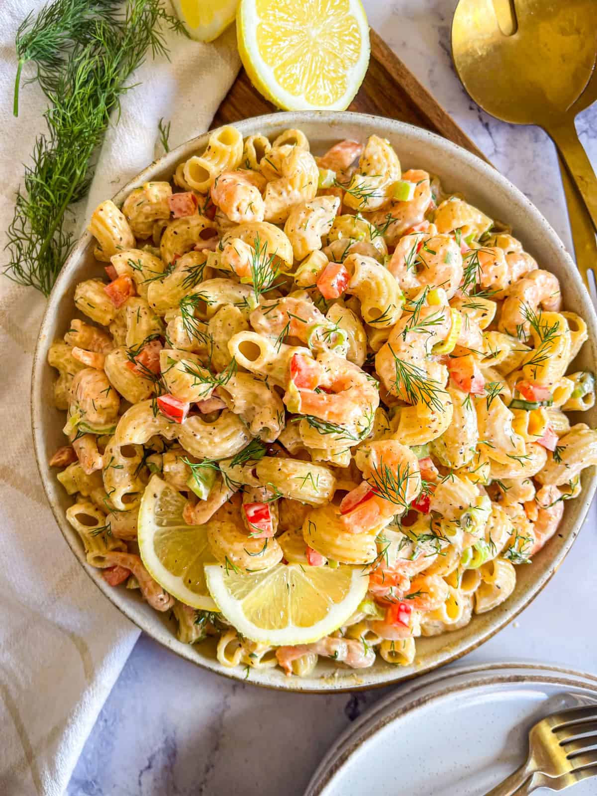 Salade de pâtes à crevettes dans un bol garni de cris d'aneth fraîche et de tranches de citron.