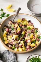 Cette salade méditerranéenne de poulpe s’inspire des régions côtières de la Grèce, de l’Italie et de l’Espagne et peut être servie comme repas léger ou en apéritif avec un verre de vin blanc croustillant. L’ajout de pommes de terre rend la salade encore plus copieuse tout en complétant le poulpe. Les pommes de terre absorbent tous les bienfaits de l’huile d’olive et du vinaigre, rendant ce plat encore plus délicieux. Pour plus de commodité, j’utilise du poulpe précuit, mais j’ai également inclus des instructions si vous souhaitez le cuisiner à partir de zéro. Pour d’autres salades de fruits de mer, essayez ma salade de crevettes piquantes et d’avocat, ma salade de calamars réfrigérées et cette délicieuse salade de crevettes italienne.