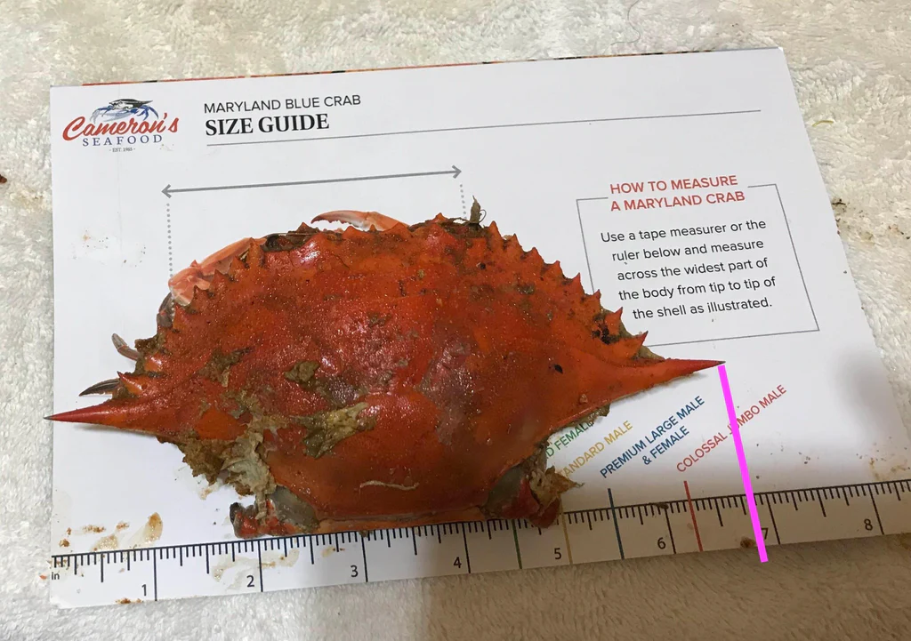 Tous les crabes mâles récoltés dans la baie de Chesapeake doivent mesurer au minimum 5 pouces d’un point à l’autre. Les crabes femelles sont soumis à quelques règles supplémentaires (j’y reviendrai dans un instant) mais, généralement, les crabes femelles sont récoltés à 4 1/2 pouces d’un point à l’autre.