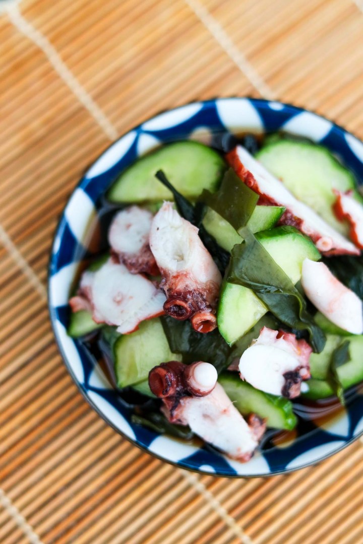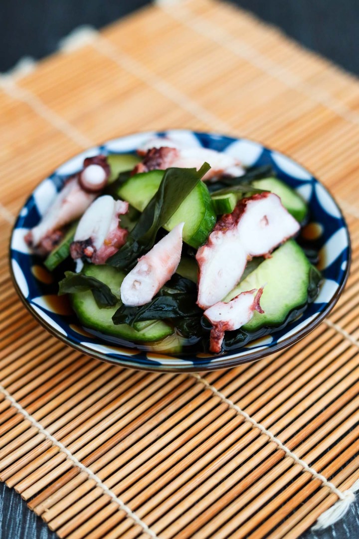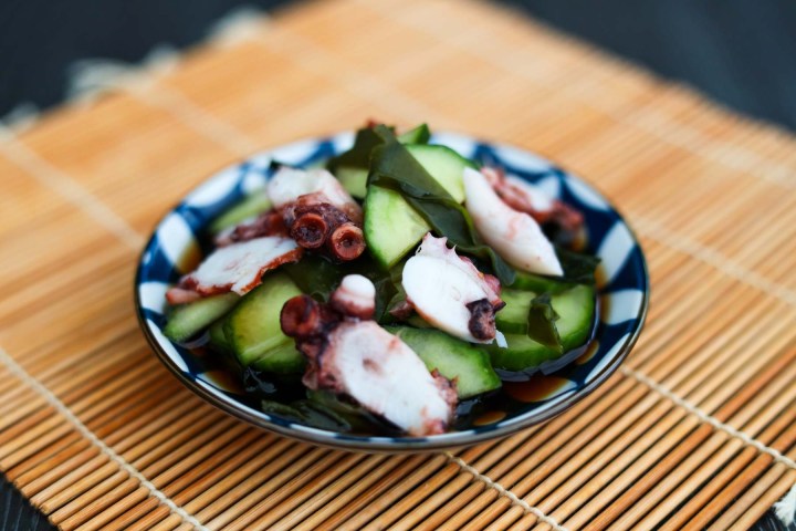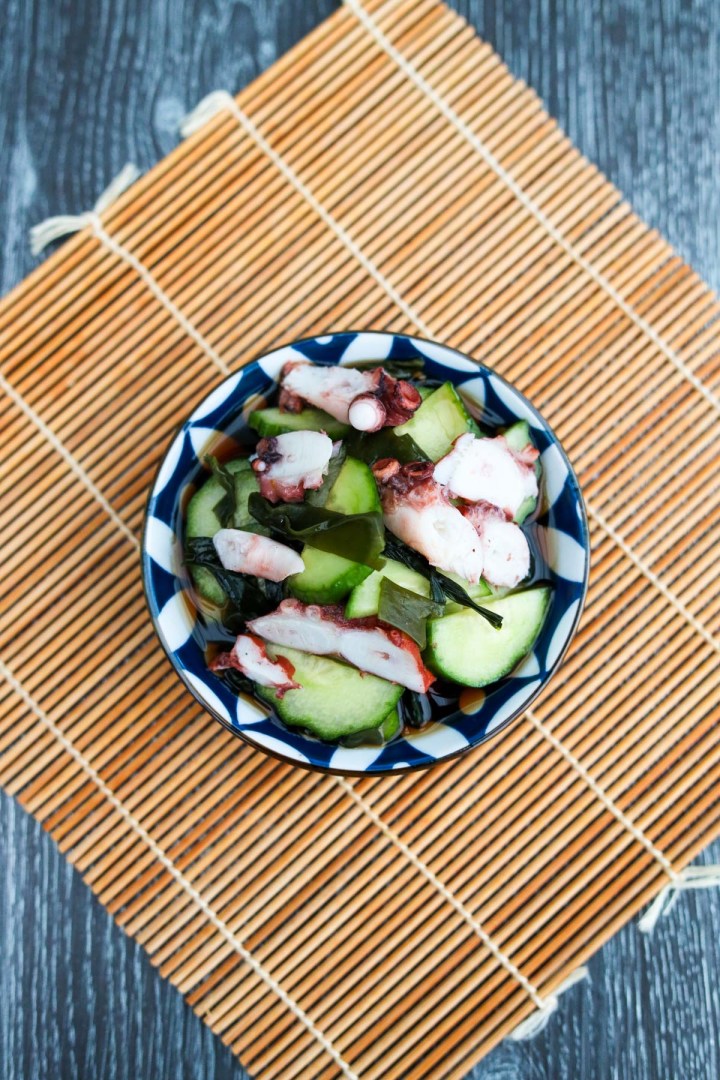 Un apéritif rafraîchissant japonais à base de poulpe, de concombre, de wakame et de graines de sésame en tranches fines dans une vinaigrette de vinaigre de riz acidulé.