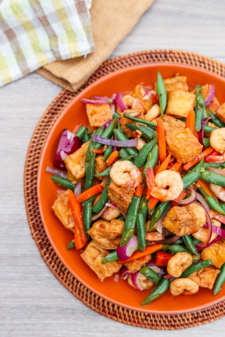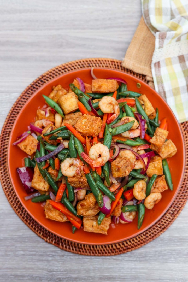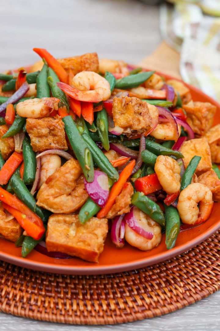 Un sauté vibrant de tofu croustillant, des crevettes succulentes et des haricots verts croustillants jetés dans une sauce salée à base de soja avec de l’ail et des piments.