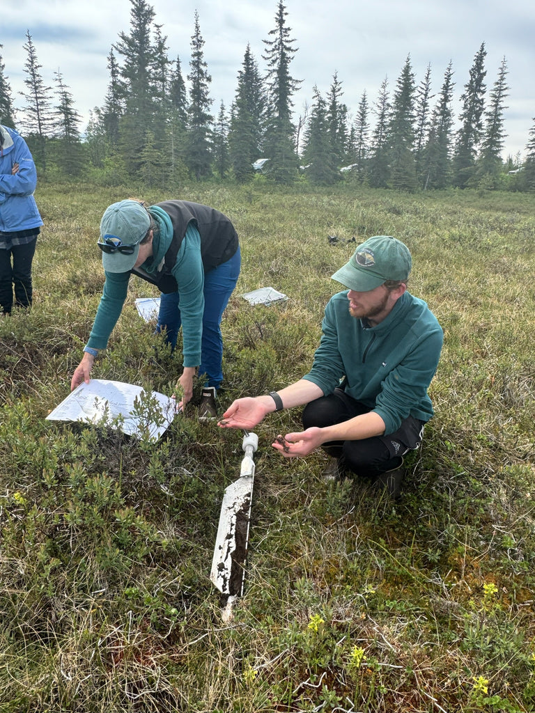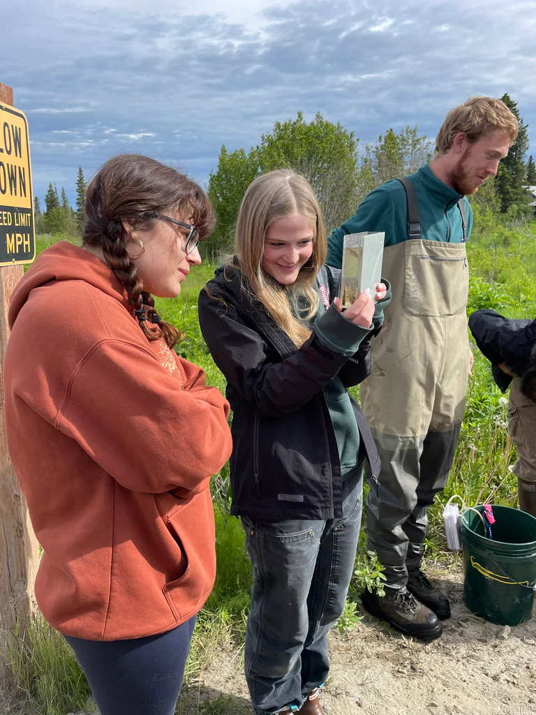 Nous avons marché avec précaution dans les vastes zones humides spongieuses. Nous avons remarqué les nombreuses petites plantes, comme des droséras et des orchidées des tourbières, sous nos pieds. Un technicien de KBNERR a ensuite plongé un carottier métallique dans la terre, en extrayant un échantillon de tourbe. Nous avons pu toucher le sol riche, frais et humide qui joue un rôle essentiel dans l’habitat du saumon. Vingt ans de recherche collaborative sur l’écologie des bassins versants du KBNERR ont révélé que l’azote et le carbone – les éléments constitutifs de la nutrition des poissons que nous aimons – proviennent des aulnes et des tourbières, puis s’écoulent des petits cours d’eau d’amont vers les estuaires et les écosystèmes marins.